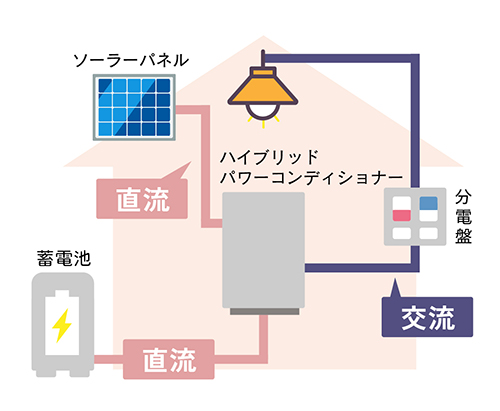 ハイブリッドタイプの蓄電池に使用されるパワーコンディショナ(※太陽光パネルで発電させた電力を、家庭で使用する電気に変換させる機械)は、1台で「太陽光発電」と「蓄電池」に対応できます。