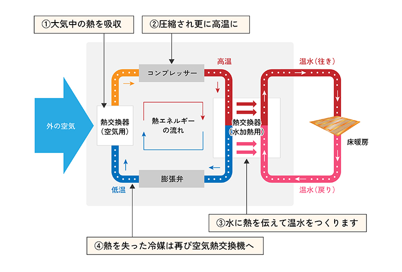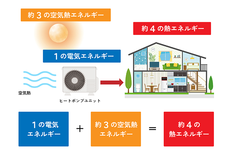 ヒートポンプ暖房とは、大気中の熱などを利用し、わずかな電力で多くの熱エネルギーを作り出すことができる、省エネ性能が高い暖房システムのことです。